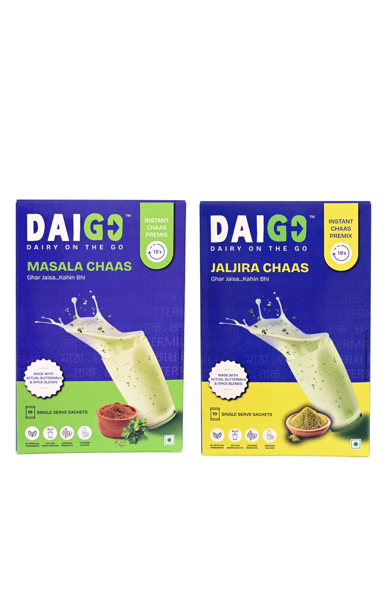 GHAR JAISA...KAHIN BHI... 100% Natural - 0 Preservatives- 10 sec Probiotic Chaas Premix. Just add normal/ cold water and shake .. 1 sachet makes 200mL (1 glass) buttermilk.